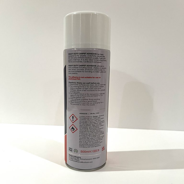 Heavy-duty carpet adhesive is specially formulated for securing carpets, underfelts, carpet tiles, felt-backed and polyurethane-backed carpets, as well as foam and paper underlays. It’s also perfect for bonding materials such as foams, fabrics, textiles, cardboard, and paper.